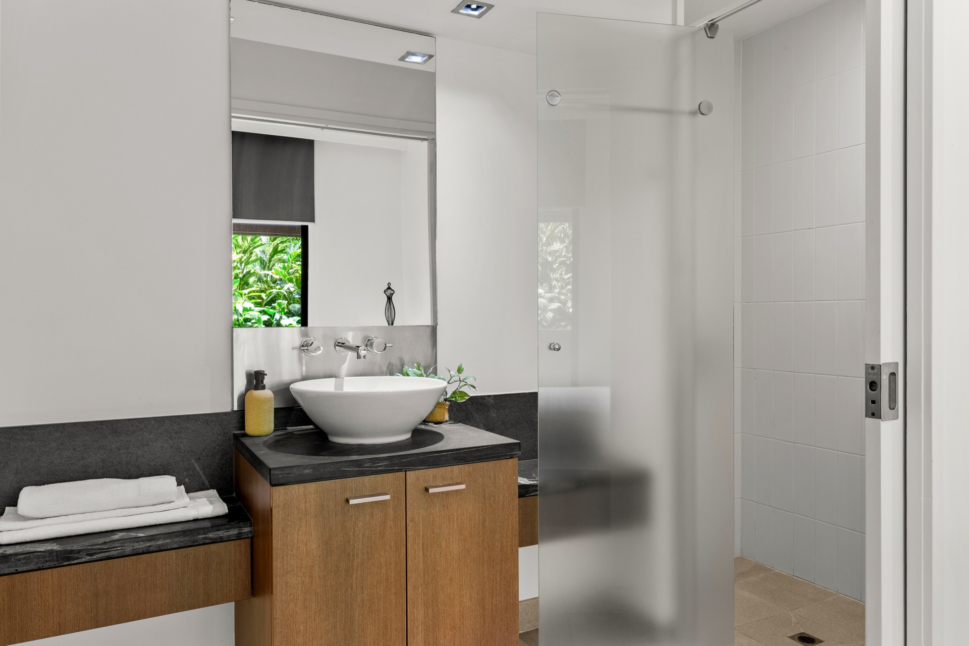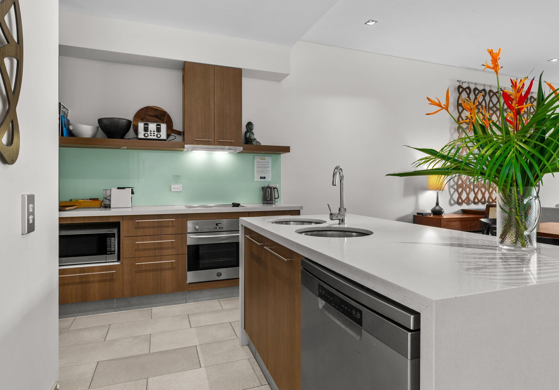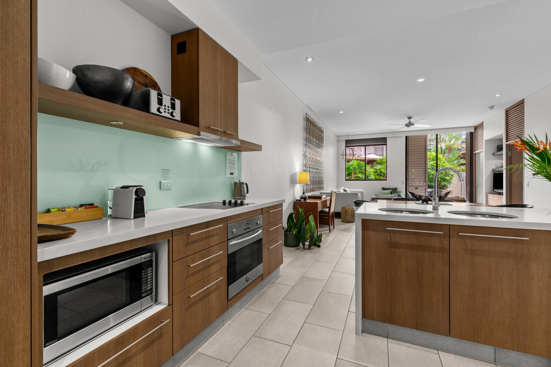 Temple 121 welcomes you with an expansive open-plan living area adorned with ambient lighting, granite benchtops, and abundant windows that infuse the space with natural light, creating an inviting indoor ambiance.