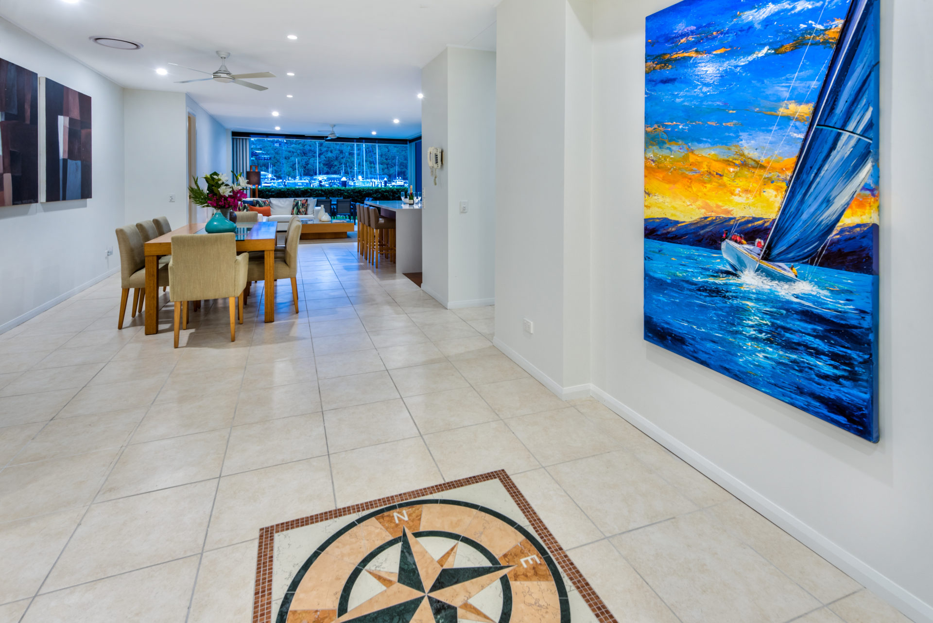 The open-plan layout is accentuated by large stacker windows and doors in the main living area and kitchen, allowing you and your guests to bring the outdoors and the ocean breezes in if desired. This ensures you can make the most of the mesmerizing views over the marina, the yacht club, and the azure blue waters of Dent Passage.