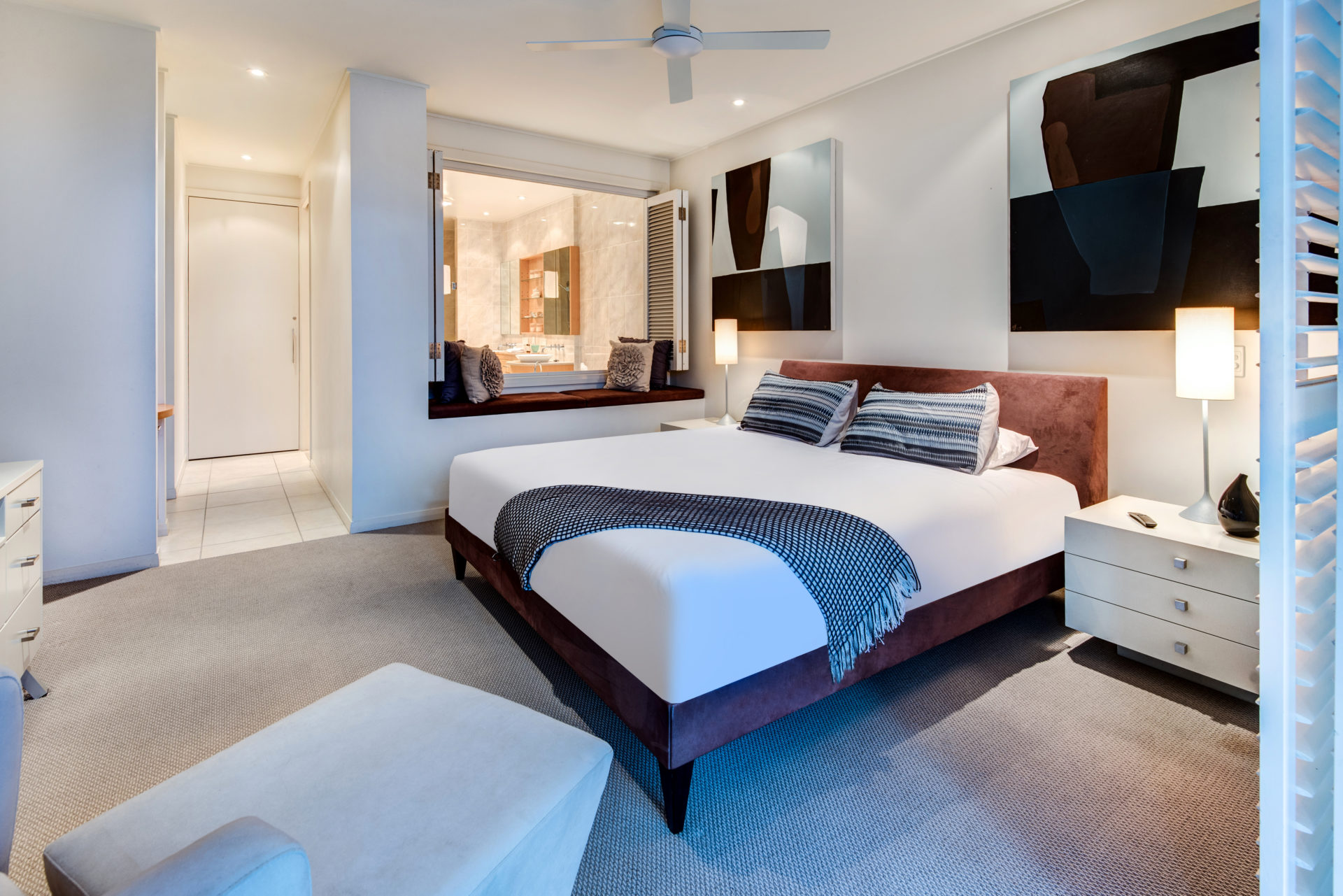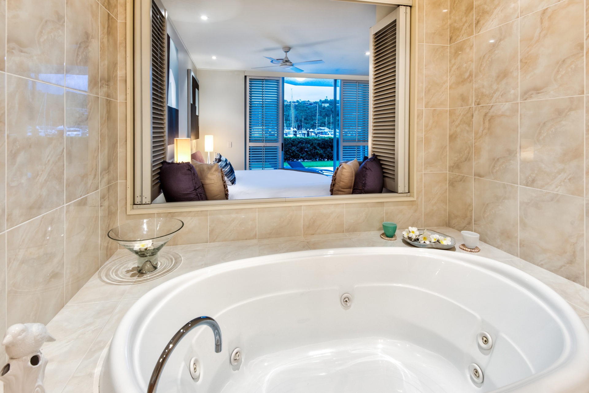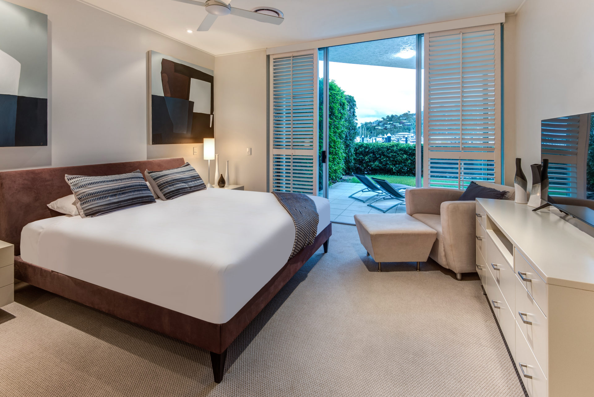 The master bedroom, separated from the two guest bedrooms for added privacy, enjoys direct access to the patio, allowing you to make the most of the incredible island and marina views. Stylishly furnished, this spacious retreat features a lush king-sized bed with opulent bedding, ensuring a restful night's sleep. The room is equipped with a flat-screen television, bedside tables and lights for reading, and a comfortable seating nook. The generous walk-in robe, a rarity in holiday accommodations, offers ample space to unpack. The master bathroom is a true showstopper, featuring a large spa bath with a window that opens to the bedroom, allowing you to enjoy the views while you bathe. His and hers sinks, generous storage options, a separate shower, and a separate toilet complete this lavish space. Every detail has been carefully considered here.