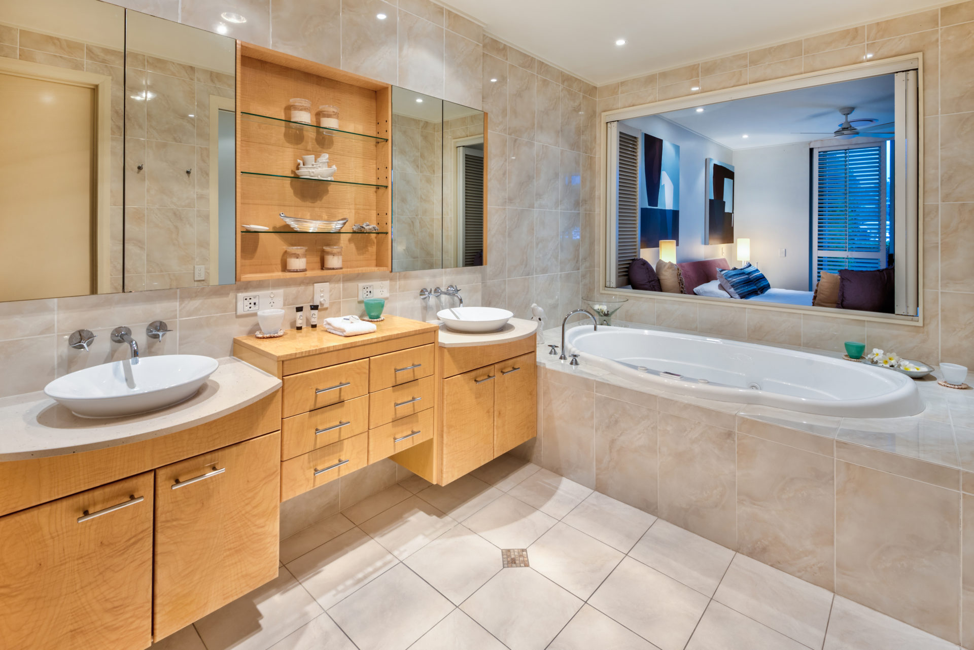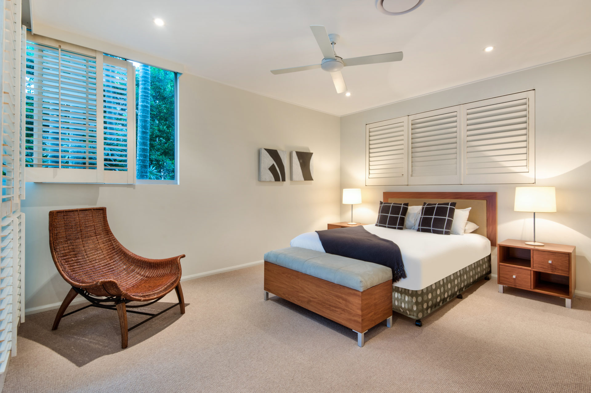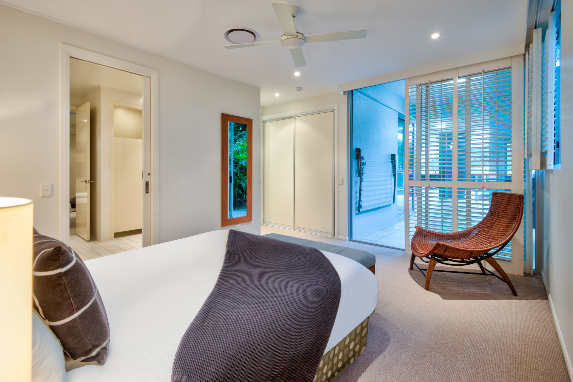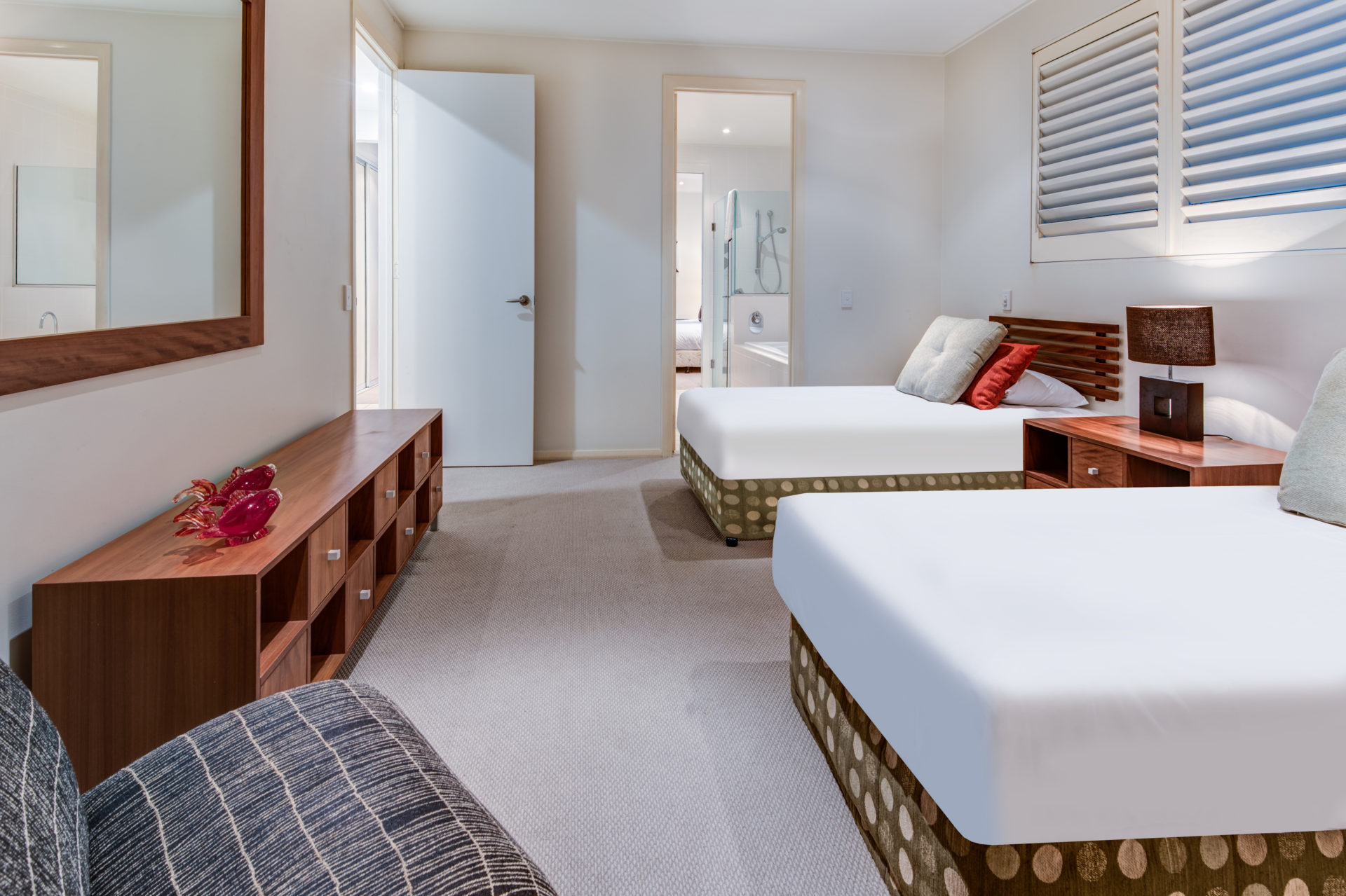 The master bedroom, separated from the two guest bedrooms for added privacy, enjoys direct access to the patio, allowing you to make the most of the incredible island and marina views. Stylishly furnished, this spacious retreat features a lush king-sized bed with opulent bedding, ensuring a restful night's sleep. The room is equipped with a flat-screen television, bedside tables and lights for reading, and a comfortable seating nook. The generous walk-in robe, a rarity in holiday accommodations, offers ample space to unpack. The master bathroom is a true showstopper, featuring a large spa bath with a window that opens to the bedroom, allowing you to enjoy the views while you bathe. His and hers sinks, generous storage options, a separate shower, and a separate toilet complete this lavish space. Every detail has been carefully considered here.